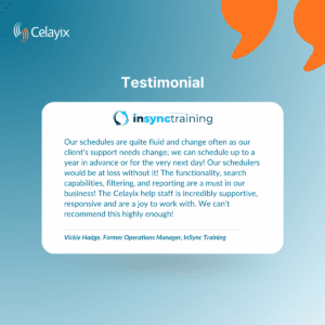 The partnership between InSync Training and Celayix is a story of mutual growth. As InSync continues to lead in virtual education, Celayix is proud to have been part of their journey, supporting them with flexible, adaptive solutions designed to grow as they do. As Erika Melmed once shared, “Celayix’s adaptability to InSync’s evolving needs—from handling increased contractor numbers to enhancing communication pathways—has allowed us to not just keep pace but to thrive.” This dedication to forward-looking, collaborative solutions has made Celayix not just a tool but a vital component of InSync’s long-term success.